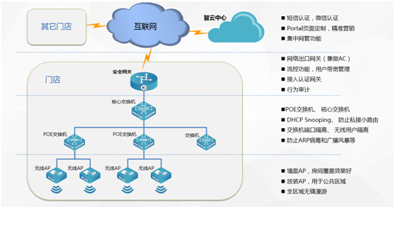 面对移动互联网大潮对传统行业的冲击,运用云计算、移动社交、大数据分析等技术,为酒店、餐饮、休闲娱乐、零售商超等商业市场客户构建基础网络平台,加速商业市场客户业务创新和转型已经刻不容缓,凯发k8国际智云商业解决方案志在为商业客户给予最强的用户体验,给予最具商业价值的云网络,给予基于portal认证,短信、微信营销功能。